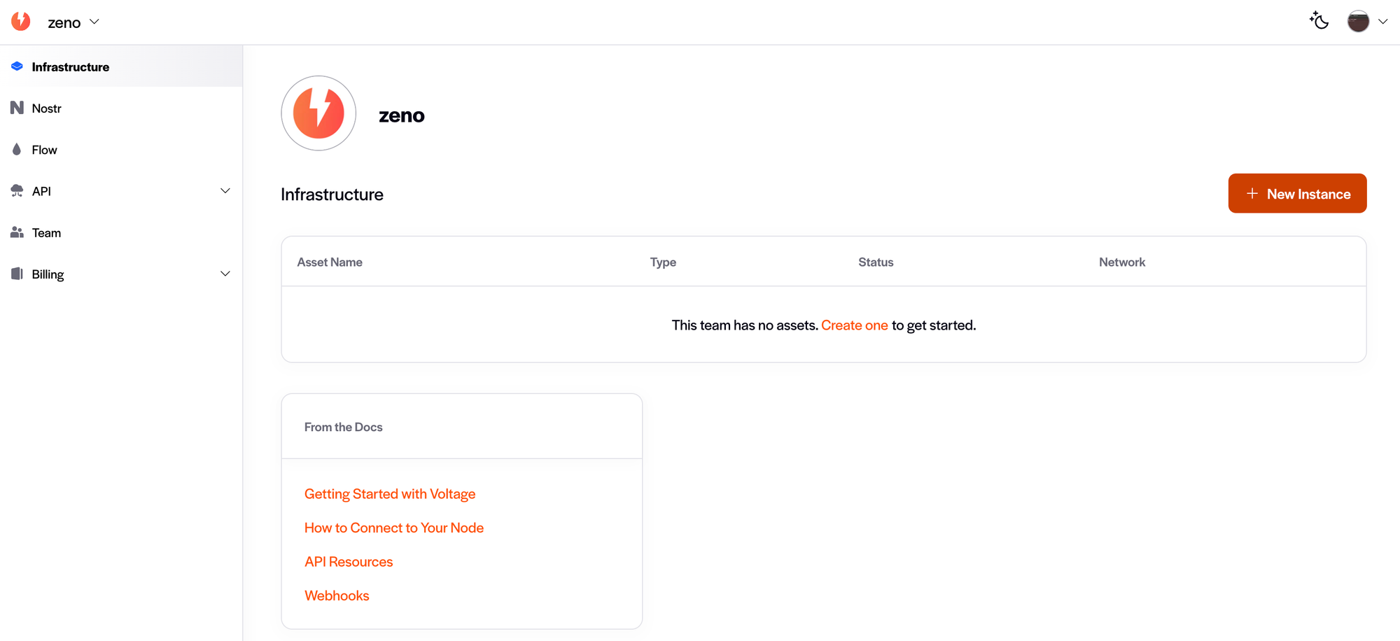First, let's create the node. If you're new, head on over to voltage.cloud and create an account. On your first login, you'll see a screen showing your newly created team. Once past that, you'll see the infrastructure page. Click on the "New Instance" button: