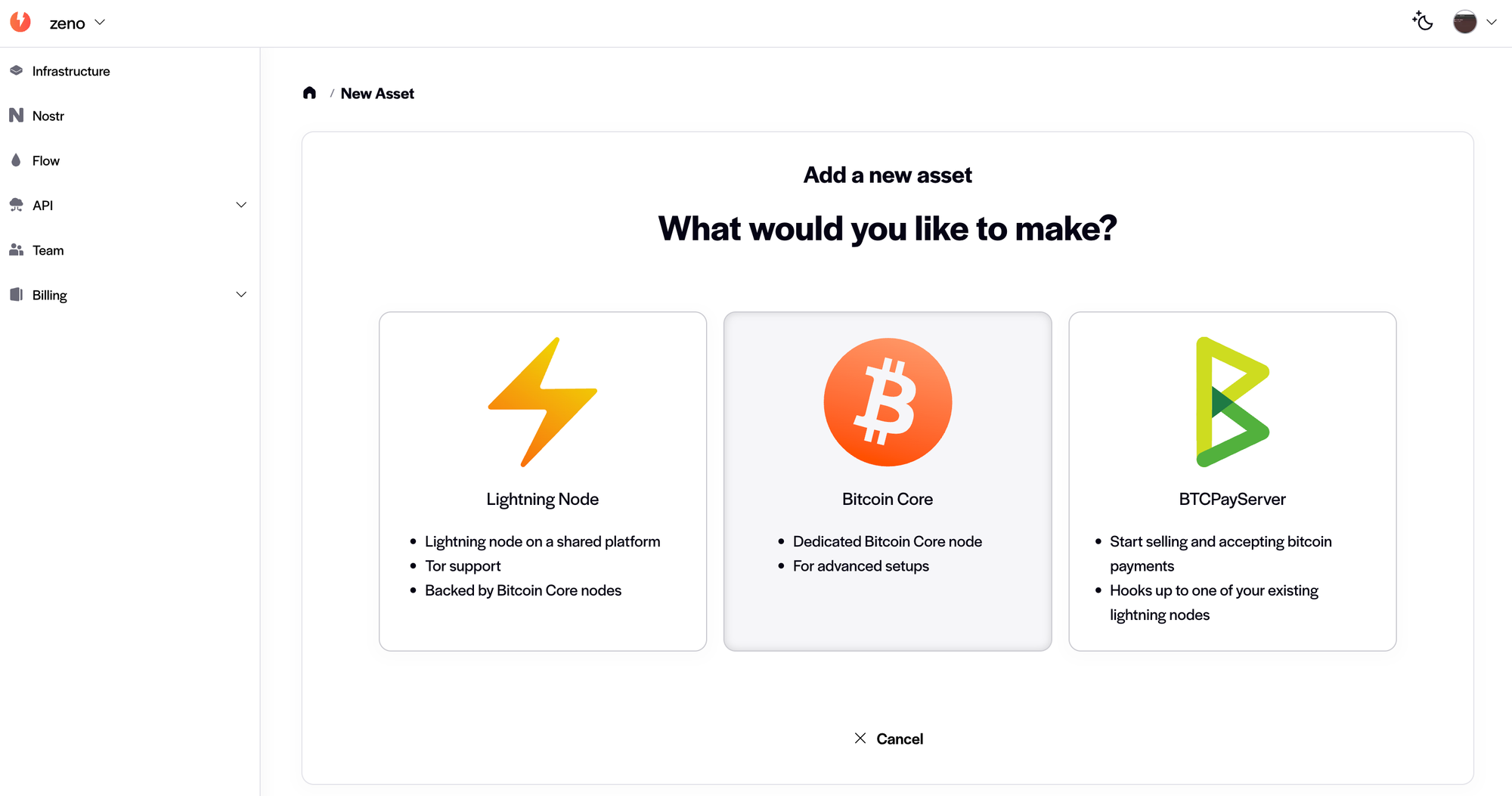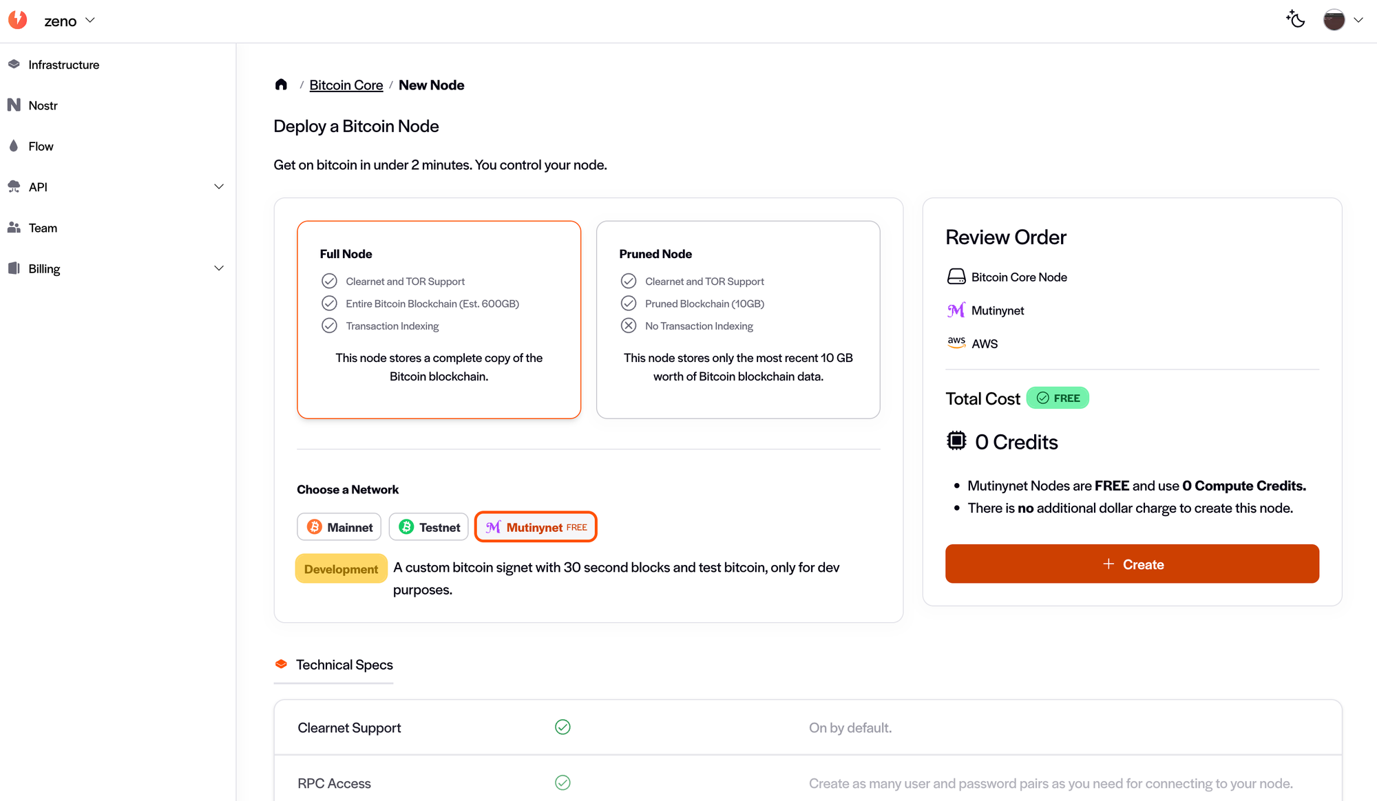 NOTE: If you are a new user or on the Essentials Plan, you must select at minimum a Starter Plan to be able to create a Mutinynet Node. See how to select a team plan here.