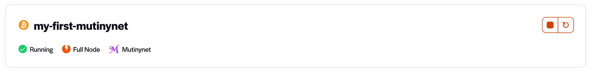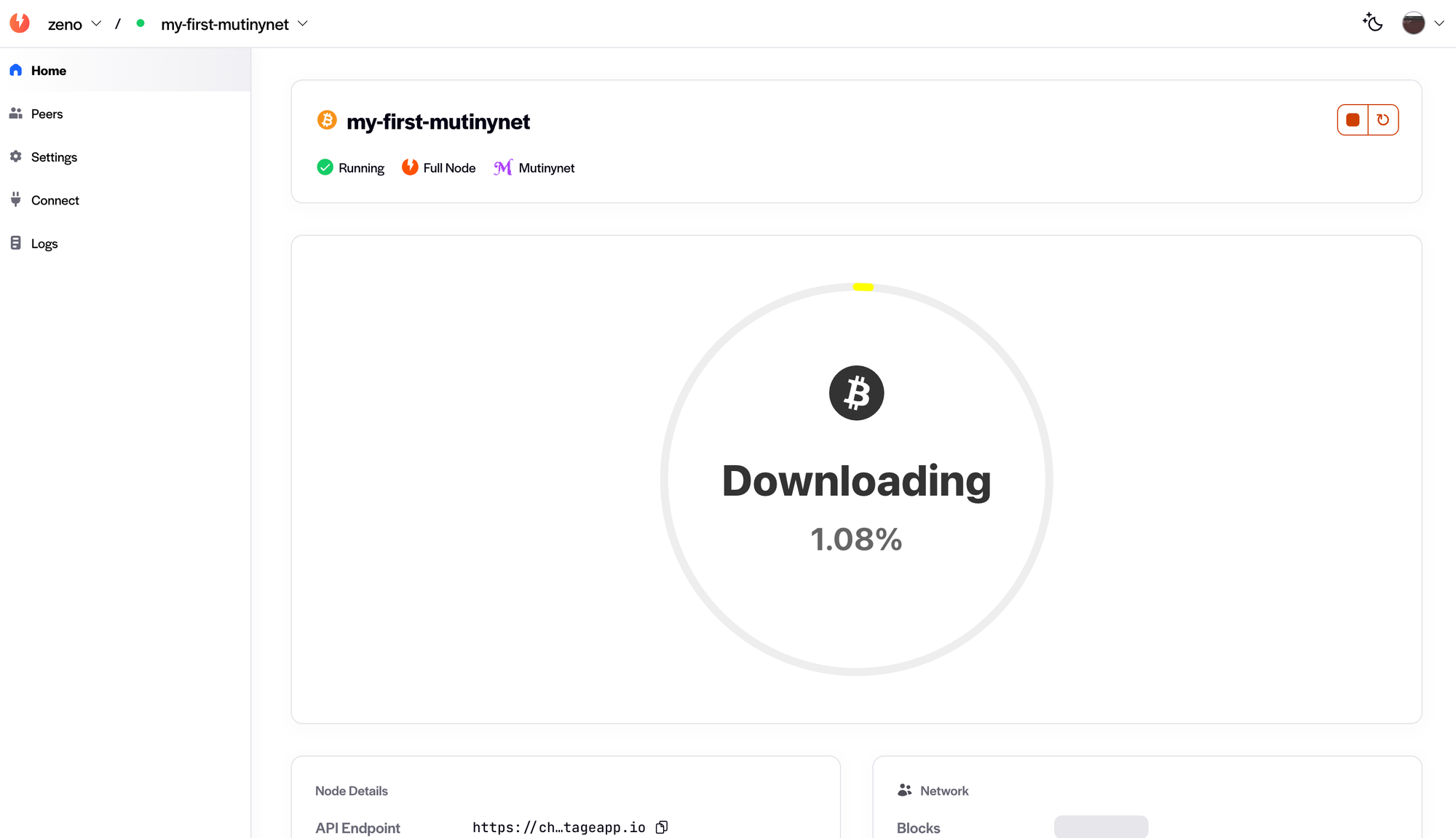 Header shows the node's name, status, whether it's a full or pruned node, and the network it runs on. In the upper right-hand corner you can stop or restart the node.