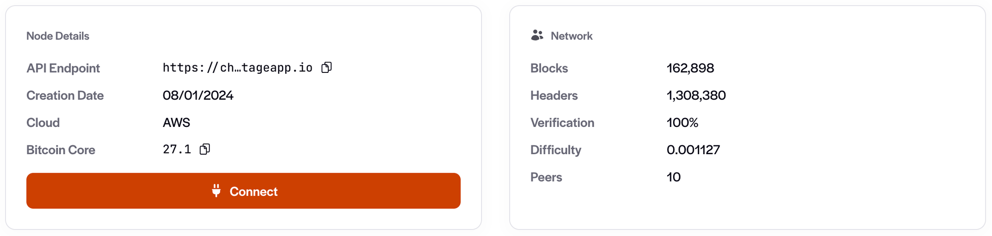 Next we have the Node Details and Network cards. The Node Details card displays high-level information pertaining to the node, such as the version and cloud it's running on. Of particular interest to us now is the API Endpoint. The Network card shows RPC info coming directly from the node itself, such as it's verification progress, the block height, and the difficulty.