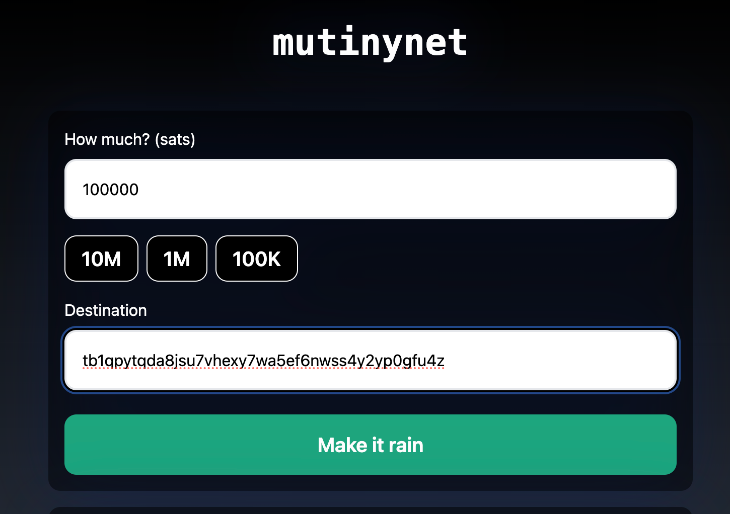 Copy the address from the command. Now go to faucet.mutinynet.com and choose how many coins you'd like to send to it, then make it rain!