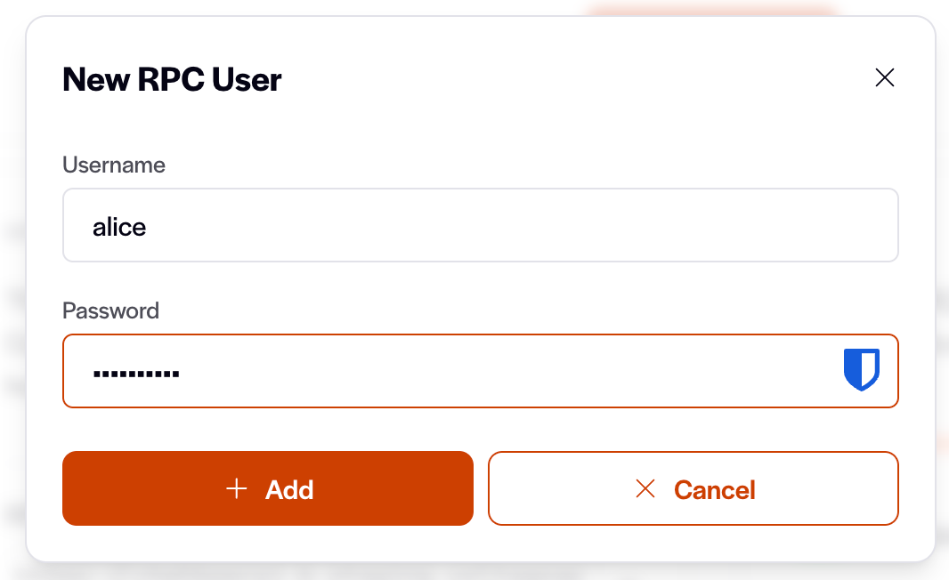 Click "New RPC User" and type in a username/password combination, then click "Add":