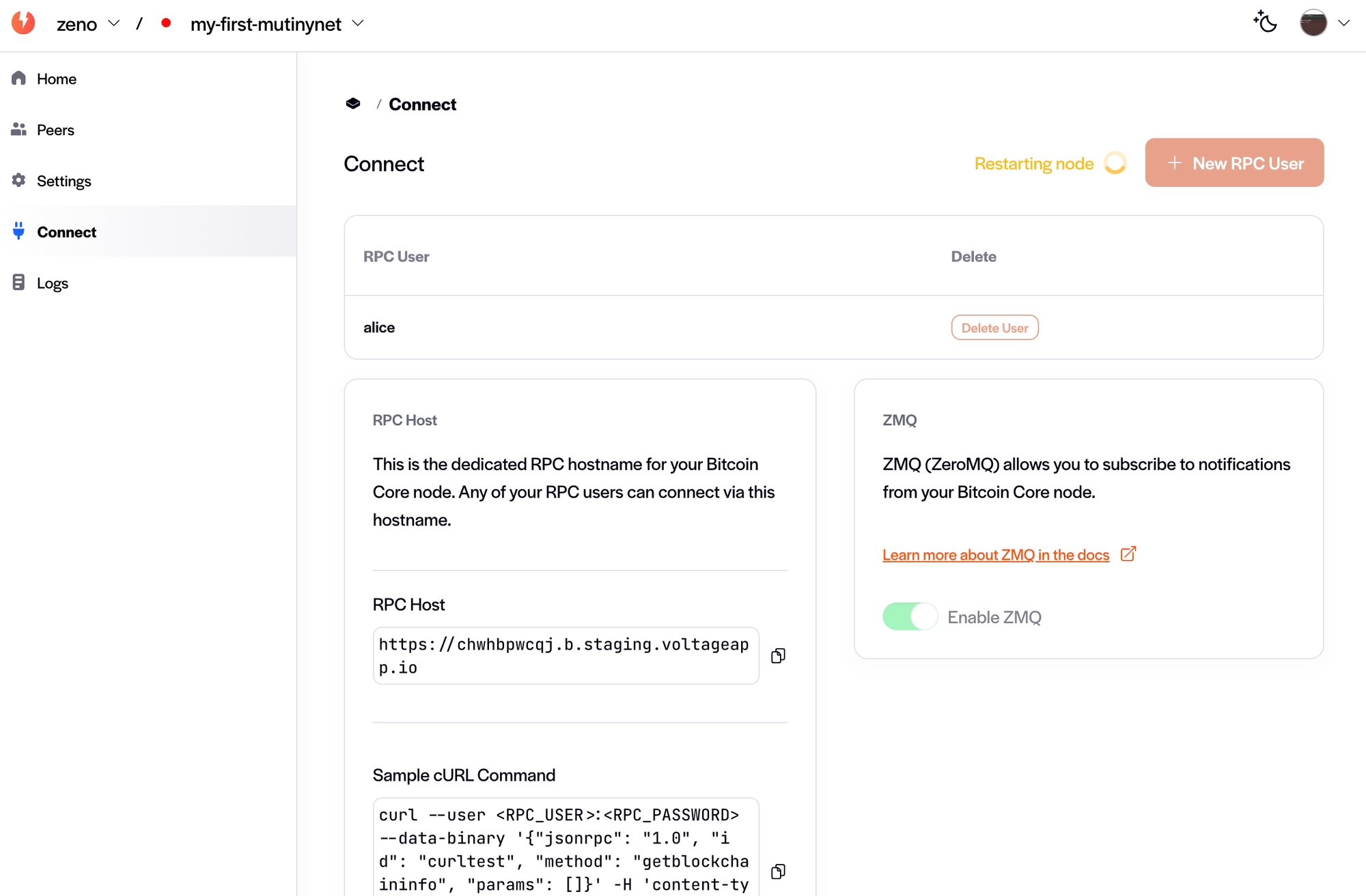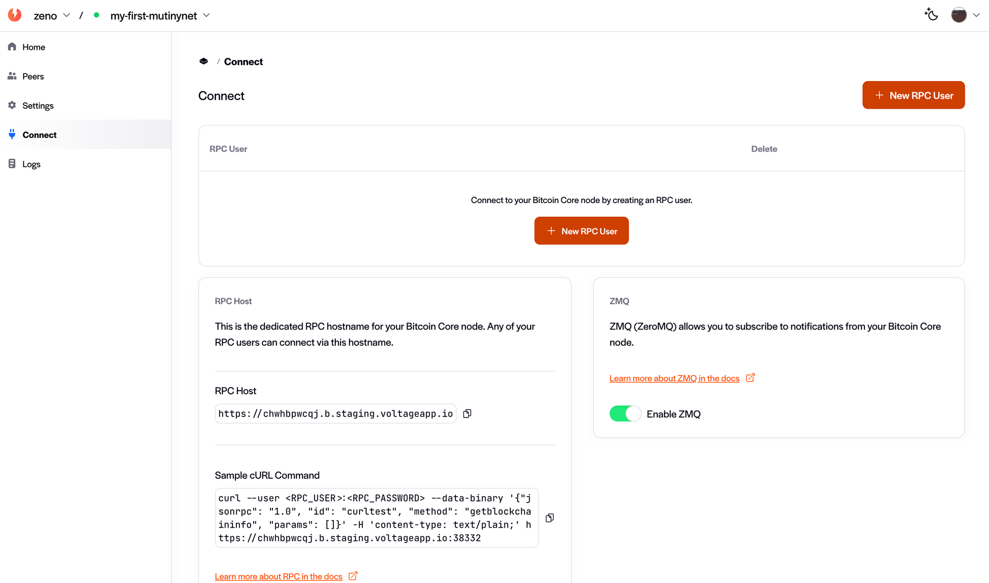 Great! You now have a node up and running. Let's take a look at the sidebar and click on "Connect". This is where you can create RPC users who can interact with the node.